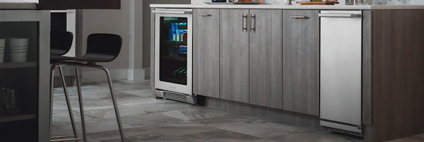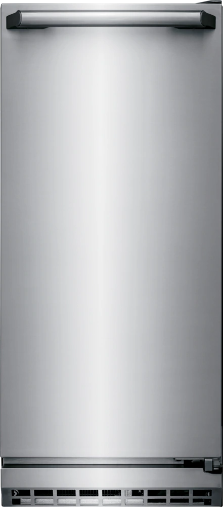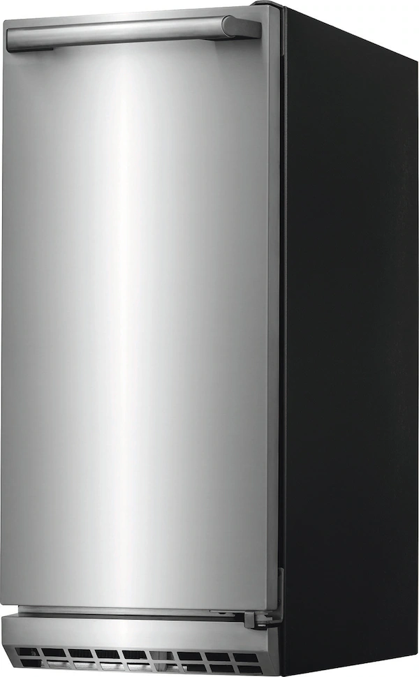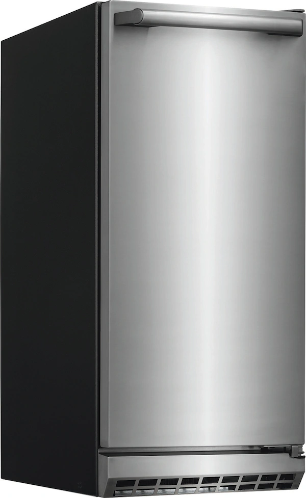 The 15″ Ice Maker with Right Hinge Door features integrated controls on the top of the door for easy access, which are hidden when the door is closed. It offers versatile installation options, suitable for both freestanding and under-counter setups, with the added flexibility of choosing the right or left door swing. For optimal installation, it’s recommended that the cabinet rough opening be increased by at least 1/4 inch over the product’s dimensions. Stores up to 30 lbs. of restaurant-style, crystal clear ice cubes and can make up to 34 lbs. of ice in a 24-hour period, and self-defrosts and self cleans for low-maintenance operation. The unit operates efficiently in eco mode, reducing water and energy usage by approximately 23%, and has a delay mode to suspend ice production for up to 8 hours or days, perfect for when the unit is not in use.