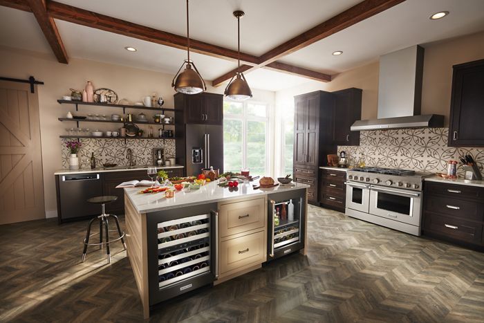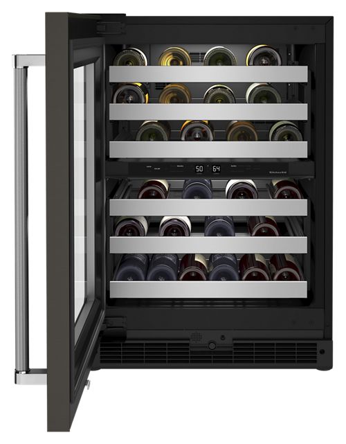 24″ Undercounter Wine Cellar with Glass Door and Metal-Front Racks. This Undercounter Wine Cellar with Full-Extension Metal-Front Racks holds up to 46 standard Bordeaux-size bottles. Two Temperature-Controlled Zones let you separate reds and whites to store each at the temperature you enjoy, and Motion-Activated LED Lighting turns on as you approach, making it easy to see what’s inside. Fully Flush Installation with Hidden Hinges provides a built-in look within cabinetry.