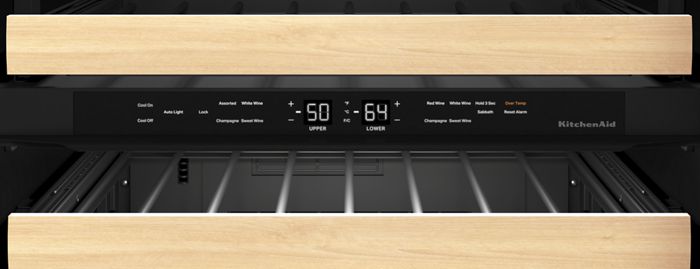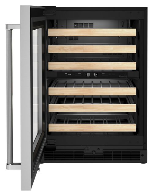 24″ Undercounter Wine Cellar with Glass Door and Wood-Front Racks. This Undercounter Wine Cellar with Full-Extension Wood-Front Racks holds up to 46 standard Bordeaux-size bottles. Two Temperature-Controlled Zones let you separate reds and whites to store each at the temperature you enjoy, and Motion-Activated LED Lighting turns on as you approach, making it easy to see what’s inside. Fully Flush Installation with Hidden Hinges provides a built-in look within cabinetry.