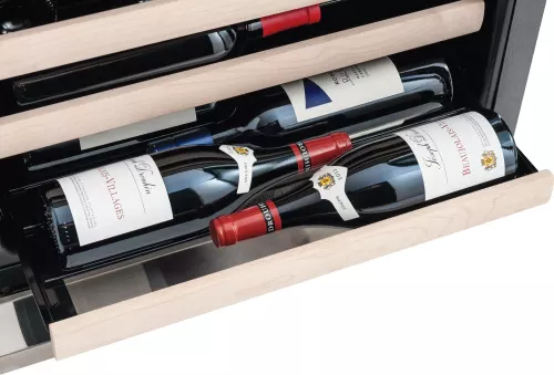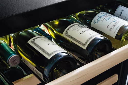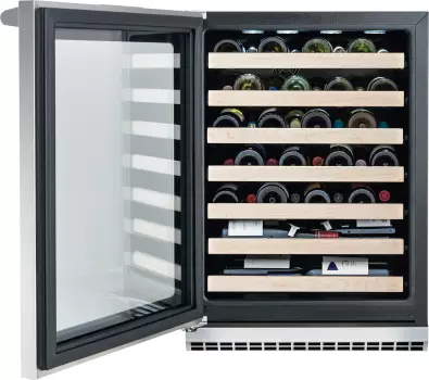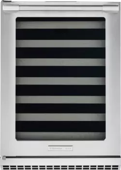 24″ Wine Cooler under-counter wine cooler provides the ultimate in luxury for proper wine storage. Seven (7) black, soft-coat wire racks cradle up to 48 standard-size wine bottles, and the racks’ maple wood fronts give them a comforting, soft finish. They extend out three quarters over Electrolux’s Smooth-Glide ball-bearing system for smooth access to wines while not disturbing them with any kind of turbulence. Showcase great vintages under theater LED lighting on the top rack. Upon opening and closing the door, interior lighting gently fades in and out for a graceful greeting and farewell to the prized collection.