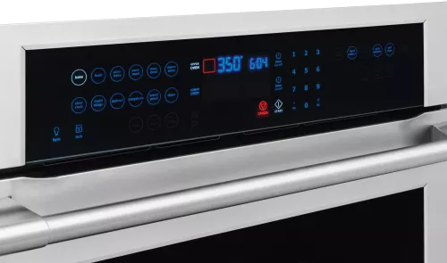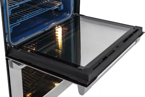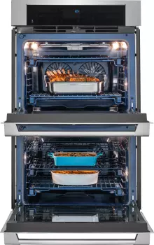 The 30″ Electric Double Wall Oven delivers ultimate convenience with advanced features to enhance your cooking experience. Its Perfect Taste Dual Convection system uses two fans with adjustable speeds to ensure even heat circulation for baking, broiling, roasting, and slow cooking. A temperature probe alerts you when the preset temperature is reached and automatically switches to Keep Warm mode. The oven boasts a signature cobalt blue interior, Smooth-Glide ball bearing racks, and a porcelain broiling pan and grill, all safe for the self-cleaning cycle. With a spacious 4.8 cu. ft. capacity in both ovens, you can cook multiple dishes at different settings. Additional features include defrosting, dehydrating, proofing dough, delay baking, and rapid preheat. The self-cleaning cycle has light, medium, and heavy settings. It’s backed by a 3-year parts warranty and a 1-year labor warranty.
