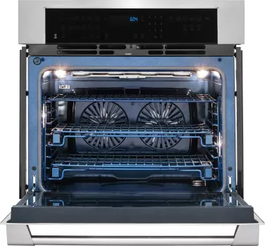 The 30″ Electric Single Wall Oven with Perfect Taste Dual Convection offers ultimate convenience with advanced features. It uses a dual-fan convection system with two-speed options, providing precise results in baking, broiling, roasting, and slow cooking. The oven adjusts temperature and time automatically based on the selected mode and includes a temperature probe that switches to Keep Warm mode once the preset temperature is reached. Its 4.8 cubic foot capacity is paired with smooth-glide ball-bearing racks and a cobalt blue porcelain broiling pan and grill. The self-cleaning mode allows racks to remain inside during cleaning. It also offers defrosting, dehydrating, proofing dough, and delay baking with rapid preheat. The oven comes with a 3-year parts warranty and a 1-year labor warranty, offering peace of mind and reliability.