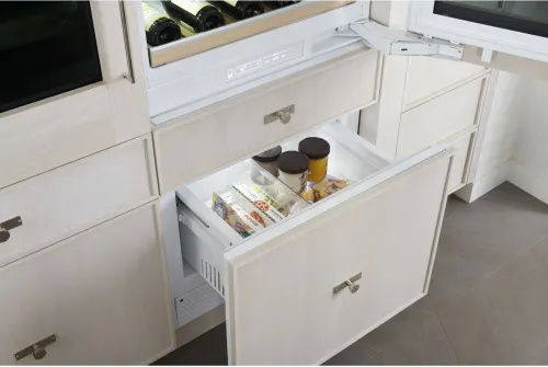 The 30-inch Built-In Panel Ready Wine Refrigerator offers an elegant, customizable design that integrates seamlessly with your cabinetry. It features a convertible lower drawer with independent temperature controls, allowing it to store wine, fresh food, or frozen items. With two temperature-controlled zones, it ensures ideal conditions for red and white wines, whether aging or ready to serve. This environmentally-friendly fridge uses R600a refrigerant instead of harmful HFCs. The freezer drawer includes a removable ice bin and scoop, making it perfect for ice storage or frozen treats. Designed for wine enthusiasts, it accommodates up to 106 bottles, with LED interior lighting providing clear visibility. The refrigerator’s minimalist design allows for custom handles and paneling, offering flexibility and personalization for any kitchen space.