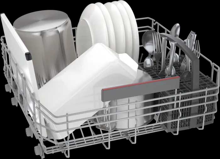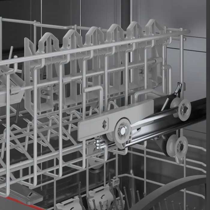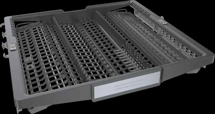 provides a flexible top rack for your utensils with expandable wings and adjustable tines to accomodate bulky and tall items.