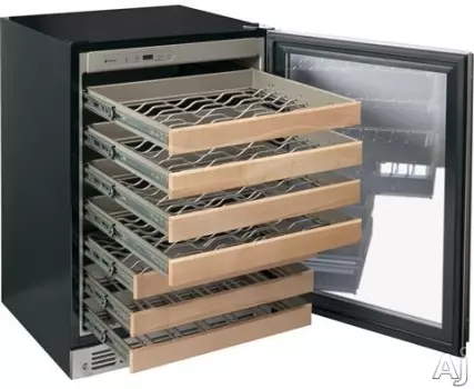 - Full-extension sliding racks: Store bottles horizontally or vertically.