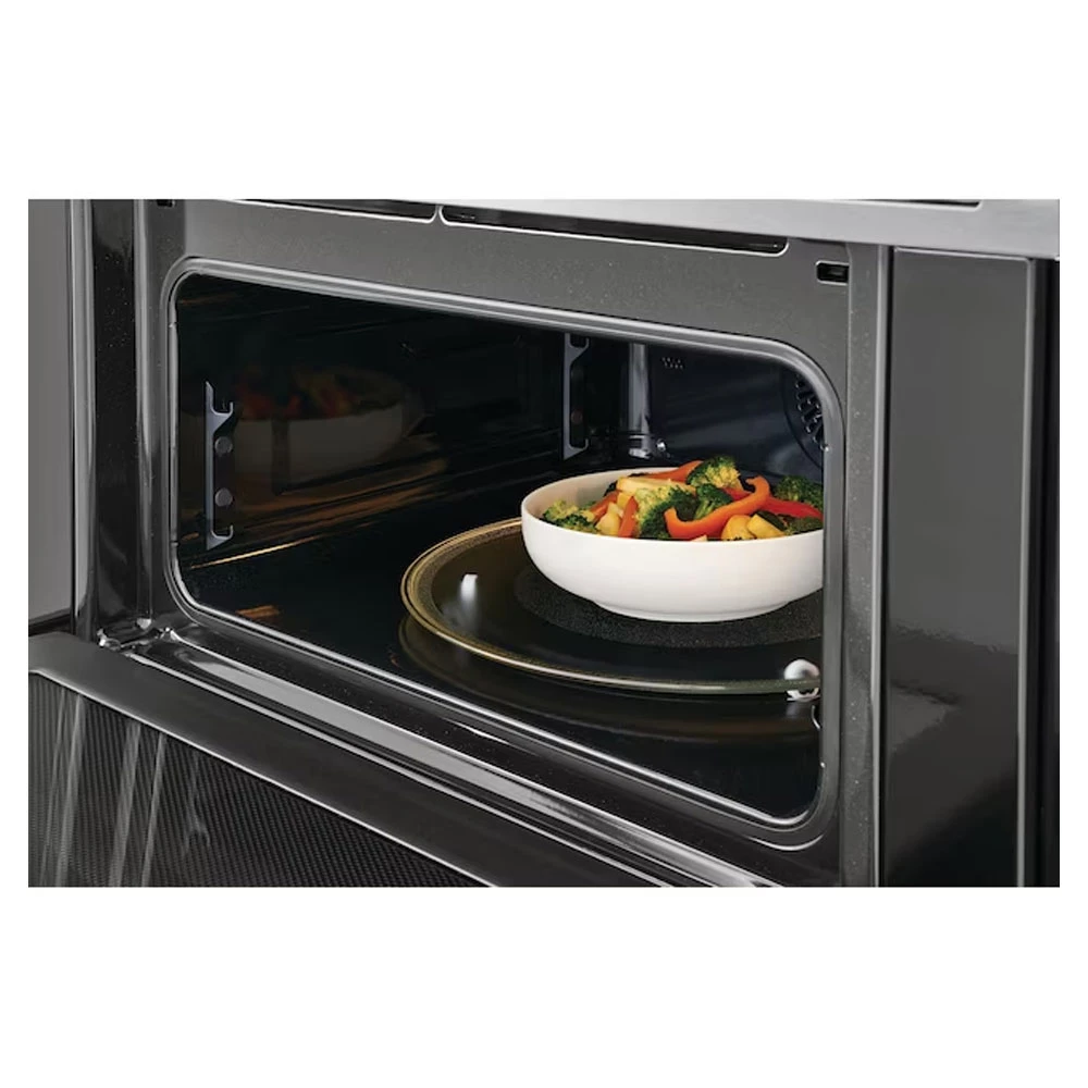The 30″ Electric Wall Oven and Microwave Combination with Total Convection offers exceptional versatility, featuring over 15 cooking modes like Air Fry, No Preheat, Slow Cook, Convection Bake, Steam Bake, Convection Roast, Steam Roast, Air Sous Vide, Bread Proof, and Dehydrate. The No Preheat option saves time, allowing you to cook immediately without waiting for the oven to heat. Slow Cook ensures food cooks slowly, locking in moisture and flavor. The extra-large 5.3 cu. ft. oven capacity lets you cook more at once, while the premium Glide Rack makes it easy to access your food. With a 4.3-inch full-color touch screen, self and steam clean cycles, and a smudge-proof black stainless steel finish, this oven combines sleek design, advanced technology, and effortless cleaning for the ultimate cooking experience.